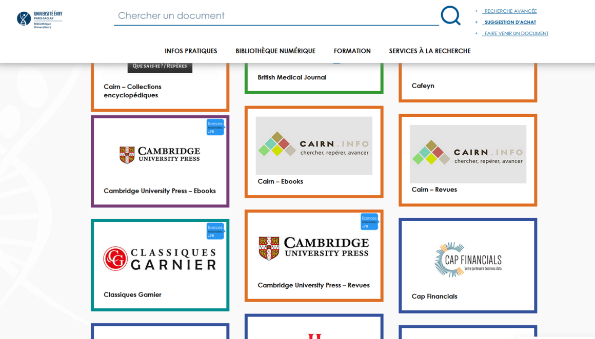 La Bu vous propose des ressources variées, tant en termes de disciplines couvertes qu’en termes de formats : bases de données bibliographiques, bases de données juridiques, revues scientifiques et ebooks, plateformes d’autoformation, streaming vidéo, streaming musical, presse en ligne…